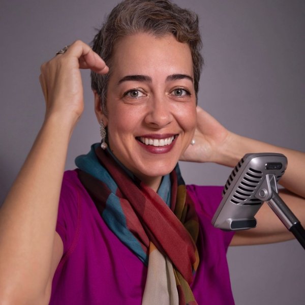 Locutora de voz grave que faz locuções em português e espanhol.
